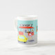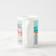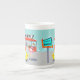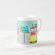 Sirva algo especial con esta taza de Diner Bone China de los años 50. El diseño de los dibujos personalizados incluye un edificio de ladrillo rojo con ventanas azules, puertas dobles grises y un cartel blanco que dice "Diner" colgado en el techo. En el estacionamiento, hay una segunda señal en un poste. El cartel tiene un fondo turquesa y una flecha roja que apunta a "Don's Diner". El cartel ha hecho su trabajo porque hay un auto amarillo brillante con las aletas aparcadas al lado. A pesar de que no podemos verlos, los pasajeros del auto deben estar golpeándose los labios. Un monótono y joven carhop está patinando patinaje sobre ruedas camino al auto. Su pelo de morena está en una cola de poniente hinchable. Lleva un uniforme corto y rosado con guarnecido negro y delantal blanco. Equilibrado por un lado, el carrito lleva una bandeja negra con una hamburguesa gigante y una refrescante y anticuada botella de refresco. El fondo de la sala está verde azulado de nubes azul claro y de siluetas de cedros.