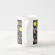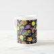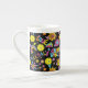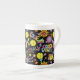 Black Bone China Mug con Groovy, estilo retro de los años 90 patrón de pickleball con bolas de picnic amarillas y fondo negro. Un gran regalo.