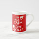 El diseño lee "guarda calma y ama cabras". Dos siluetas de la cabra se colocan en las letras. Es un hermoso diseño, grande para cualquier persona que trabaje con las cabras, guarda cabras, o apenas ama cabras.