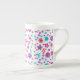 Una taza de bonito de China ósea para personalizar, con un patrón de flores en morado, turquesa, rosa y naranja en un fondo blanco, de un collage de papel pintado a mano de Judy Adamson.