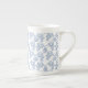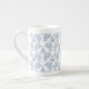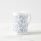 Un tazón de café de la China ósea, con una estampada floral típicamente india en azul índigo sobre un fondo blanco que se puede cambiar si se desea. Forma parte de la colección "Indigo" de Posh y Painterly. Este patrón se puede ajustar fácilmente para que se ajuste a cualquier Mug.