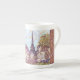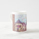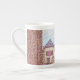 El puntillismo inspirado en París en esta taza de porcelana ósea fue creado por Kristie Hubler, con la Torre Eiffel presentada, entre tablas de madera, en un estilo de puntillismo