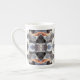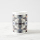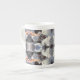La obra de arte original de esta taza de tonalidad de China es un patrón hecho a partir de una fotografía original de HomeWare de conchas marinas. Las conchas de la foto son conchas de conchas, en su mayoría de color blanco o crema, que se ven a la luz del sol y a la sombra. Una de las conchas del mar tiene un interior de color salmón claro y algunas de las sombras son de color azul claro. Esto da al diseño una suave paleta de pasteles con tonos grises y blancos claros. Las formas que fluyen de cada concha marina le dan profundidad a este diseño complejo.