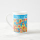 Mug de China ósea para personalizar, con un patrón general de flores rojas, naranjas y amarillas en un brillante fondo turquesa; de un collage de papel pintado a mano de Judy Adamson.