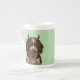 English Springer Spaniel (liver and white) looking devilishly mischievous and naughty - complete with devil horns on one side of this bone china mug with an angelic springer spaniel on the other.
