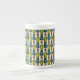 Un elegante tazón de café de la China ósea, con un patrón decorativo 'tribal' en verde y Verde azulado, delineado en negro, sobre fondo crema. Parte de la colección "Tambores de la jungla" de Pintorly y Pintorly.