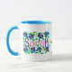 Una taza blanca del "campanero" de la buena calidad con los azules claros bordea y dirige. El diseño, frente y parte posterior, es un collage de papel pintado a mano de las flores, hojas y la "Sarah conocida" y el texto lee mientras tanto, "esta taza pertenece a Sarah". Vea también hacer juego los regalos, la tarjeta de felicitación y la ropa. Lavaplatos y caja fuerte del mictrowave.