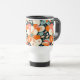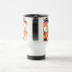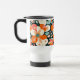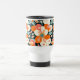 A travel mug decorated with bold orange, coral, and cream florals on a deep background, offering a modern, elegant look for drinks on the go and a stylish gift for anyone who loves artistic, colorful drinkware.