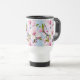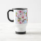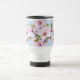 A travel mug featuring delicate cherry blossom branches in soft pinks and greens against a serene blue background, bringing an elegant, calming touch to coffee on the go. A refined, gift‑ready choice for nature lovers and admirers of graceful floral design.