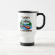 Una linda foto de un lago con un barco de pesca atado al muelle, con el título Café de la cabina, sabe mejor; esto hace la taza de café perfecta para la cabaña, o salir en el bote.