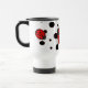 Esta taza de viaje blanca presenta 3 mariquitas en un fondo manchado