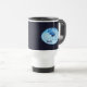 Imagen en azul y blanco de un alce de vaca en un entorno urbano durante el invierno. También aparece un texto de personalizable que dice "Alaska". Puede añadir texto adicional en el reverso. Moose son residentes de todo el año en muchas comunidades de Alaska. Aquí en Anchorage hay unos 1500 animales, junto con lobos, osos marrones y otros animales salvajes. Por lo general se comportan bien. A menudo cruzan las calles en los pasos de peatones después de esperar una señal de marcha.