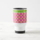 Una moda, no spill Travel Mug para personalizar, con patrones de bonito mix'n'match de puntos jumbo de polka blanca en rosa profundo y un patrón de mini-impresión de primroses amarillos y puntos de polka verde, también en rosa profundo. Parte de la colección "Primroses" de Posh & Painterly.