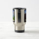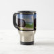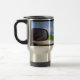 LOS OBJETOS EN EL ESPEJO ESTÁN MÁS CERCANOS DE LO QUE APARECEN - Este es el texto en esta Taza de viaje de una fotografía original de ZoeSPEAK, tomada mientras conducía por la carretera que sale de Key West, Florida. La foto es una vista a través de la ventana de la camioneta del espejo retrovisor y el paisaje de los Keys, el gran cielo azul, nubes esponjosas, aguas del Golfo y vegetación. Detrás de la parte superior izquierda del espejo hay una señal de carretera amarilla y negra. Esto se refleja en la ventana de la camioneta como una barra diagonal amarilla en la esquina superior izquierda de la imagen.