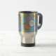 Manténgase hidratado durante su viaje con este tazón para viajar/viajar al trabajo decorado con un colorido patrón de conchas rojas, amarillas y violetas en acuarela, sobre un fondo azul claro. Disponible en acero inoxidable de plata o blanco, así como en diferentes estilos y tamaños de taza. Personalízalo añadiendo tu monograma.
