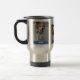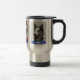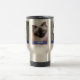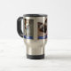 Personalice esta taza de viaje con 3 fotos mascotas de sus peludos familiares y sus nombres o 3 fotos del mismo mascota. Tres barras azules horizontales tienen espacio para sus nombres con letras blancas.