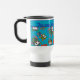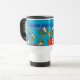 Una fresca taza de viaje para personalizar, con un patrón de búhos lindos en rojo, azul, verde sobre un fondo azul turquesa. El patrón de búho proviene de un diseño original de collage de papel pintado a mano de Judy Adamson.
