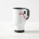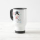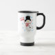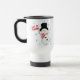 Esta es una divertida taza con temática invernal, con un hombre de nieve bailando en la nieve usando un gorra y una bufanda, con las palabras "Que nieve".