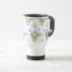 Una taza de viaje floral de bonito, con un patrón de rosas rosadas, cremoso blanco Naranja Mock Blossom y lavanda morada, de un diseño acuarela pintado a mano por Judy Adamson.