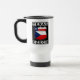 Texas Czech American Travel Mug. Diseño checo de Texas, en el estilo de un genial cartel de la ruta estadounidense. El texto Texas Czech está en la parte superior e inferior, con la bandera del Estado de Texas y la bandera de la República Checa dentro del signo de la ruta. Excelente para los texanos de ascendencia checa, y para los expatriados en el estado de la estrella solitaria.