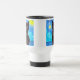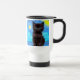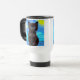 ¡Mug de viajes con un gato negro en la pintura Starry Night de Van Gogh! Este gatito de ojos azules mira adorablemente desde un fondo de remolinos azules y una brillante luna amarilla. ¡Un regalo fantástico para los amantes del gato y para los coleccionistas holandeses de arte!