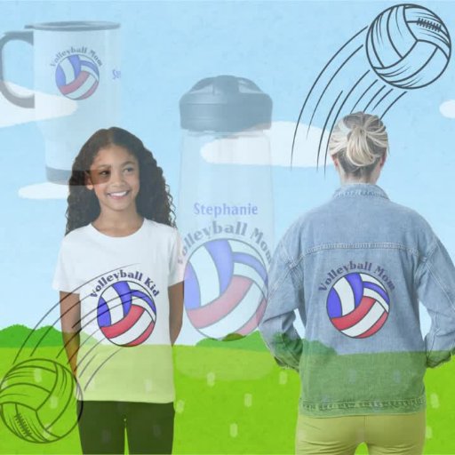 Volleyball Mom text curved around a red, white and blue volleyball. Mom's name is in matching royal blue in the middle. Good gift for Mother's Day.