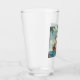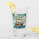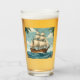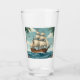 Es una taza de vidrio transparente con una imagen de un barco de exploración.