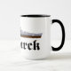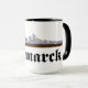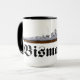 Taza con dibujo del famoso acorazado alemán Bismarck de la segunda guerra mundial con el nombre del barco escrito con letras fraktur.