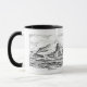 Taza con dibujos del famoso acorazado alemán Bismarck de la segunda guerra mundial con el nombre del barco escrito con letras fraktur.
