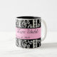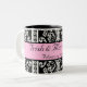 Taza blanco y negro preciosa del damasco con una raya rosada en el centro para el texto. El personalizar con sus nombres y el boda fechan para un gran pequeño le agradecen regalo o utilizar para sí mismo. Grande para casar los desayunos.