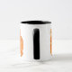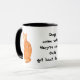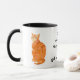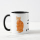 Una taza blanca del campanero con una manija y un borde negro y un gato pintado a mano del jengibre. La cita de Maria Bl, lee, los "perros vienen cuando se llaman, los gatos le vuelven."