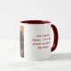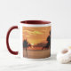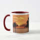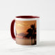 la taza blanca con el borde rojo y la manija, imagen de la puesta del sol roja, anaranjada, amarilla de las zonas tropicales con las palmeras, y del texto lee: "No tengo flashes calientes. Tengo vacaciones privadas cortas en las zonas tropicales."
