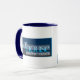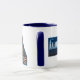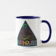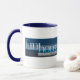 La taza del funhouse de 15 onzas es más que un mouthfull. Atracción del logotipo original y del nuevo logotipo en una taza blanca con el borde y la manija azules.