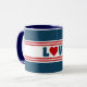 Diseño de amor con forma de corazón en estilo náutico sobre fondo rayado azul, rojo y blanco