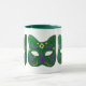Esta mug inusual presenta un diseño fabuloso basado en una máscara de gato veneciana en los colores tradicionales del Mardi Gras.
