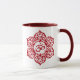 Un Aum u OM diseña se sienta dentro de una flor de loto estilizada. El modelo circular se colorea con un de color rojo oscuro que se destaque para crear un brillo ligero en la superficie. Seis hojas elegantes alcanzan hacia fuera del centro del diseño para crear un modelo simétrico en esta taza de moda. Este diseño elegante es una representación llamativa de este símbolo espiritual.