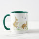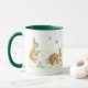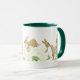 Una taza blanca con un mango verde oscuro y un labio con un diseño de Conejos de Pascua escondiendo huevos de Pascua, de un diseño pintado a mano por Judy Adamson.