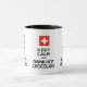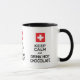 Divertido guarde la calma y beba la taza del chocolate caliente con la bandera suiza.