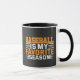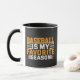 ¡A cualquiera que le guste el béisbol le encantará esta taza con temas de béisbol que muestra un texto de oro y blanco que dice ¡El béisbol es mi estación favorita!