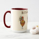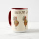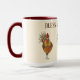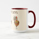Este tazón de café de dos tonos es adornado por algunos pollos de colores bonitos para ayudarle a preparar su bebida matutina favorita. Tres pollos junto con texto que lee Bless My Chickens con interior y mango de color rojo marrón. Múltiples colores sobre fondo marfileño en la taza blanca. Personalizar este artículo o compra como diseñado. Imagen de stock freepik.com