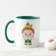 Start your day with a cheerful wave from this adorable Buddy the Elf Cartoon Mug! This mug features a cute, simplified graphic of Buddy in his iconic elf suit, ready to bring a smile to your face. With its simple design and a classic white exterior contrasted by a dark green handle and interior, this mug is a perfect, subtle piece of Elf Movie Merchandise. It's ideal for coffee, hot cocoa, or any festive drink. It makes a wonderful, unique Christmas gift for friends, coworkers, or anyone who believes in the spirit of the season!