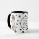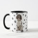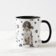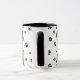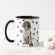 Un adorable Springer Spaniel Dog te mira desde dos lados de esta taza. El texto entre las dos imágenes dice "En el octavo día, Dios creó el SPANIEL y lo llamó MUY BUENO". Las imágenes del perro y el banner ovalado blanco que contiene los campos de texto se colocan sobre un fondo blanco con huellas de pata negra. ¡Qué lindo!