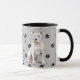 Un hermoso perro blanco argentino se sienta en dos lados de esta taza. El texto entre las dos imágenes dice "En el octavo día, Dios creó el DOGO ARGENTINO y lo llamó MUY BUENO". Las imágenes del perro y el banner ovalado blanco que contiene los campos de texto se colocan sobre un fondo gris con huellas de pata negra.
