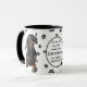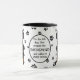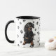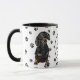 Un adorable perro negro y moreno de Dachshund parece inquisitivo en dos lados de esta taza. El texto entre las dos imágenes dice "En el octavo día, Dios creó el DACHSHUND y lo llamó MUY BUENO". Las imágenes del perro y el banner ovalado blanco que contiene los campos de texto se colocan sobre un fondo blanco con huellas de pata negra. ¡Qué lindo!