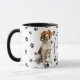 Un hermoso perro de Bretaña se sienta en dos lados de esta taza. El texto entre las dos imágenes dice "En el octavo día, Dios creó al PERRO BRITÁNICO y lo llamó MUY BUENO". Las imágenes del perro y el banner ovalado blanco que contiene los campos de texto se colocan sobre un fondo blanco con huellas de pata negra.