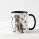 Un hermoso perro pintor alemán con cabellera se sienta en dos lados de esta taza. El texto entre las dos imágenes dice: "En el octavo día, Dios creó el PUNTERO WIREHAIRED y lo llamó MUY BUENO". Las imágenes del perro y el banner ovalado blanco que contiene los campos de texto se colocan sobre un fondo blanco con huellas de pata negra.