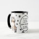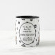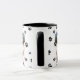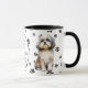 Un adorable perro chií tuzú se sienta en dos lados de esta taza. El texto entre las dos imágenes dice "En el octavo día, Dios creó el PERRO SHIH TZU y lo llamó MUY BUENO". Las imágenes del perro y el banner ovalado blanco que contiene los campos de texto se colocan sobre un fondo blanco con huellas de pata negra.
