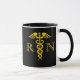 Una imagen de un símbolo médico caduceus y letras estilizadas R y N - Enfermera inscrita. Elegante tazón de café artístico. Puede transferir este diseño a otro producto, simplemente utilice la opción a continuación. Diviértete, compra uno, disfruta, mantente a salvo y sé feliz!