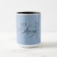 El diseño presenta la enriquecedora frase "Ella es fuerte", estilizada en una tipografía elegante y audaz que encarna fuerza y resiliencia. Al lado del lema, un minimalista dibujo de una mujer que se va agrega un sentido de movimiento y libertad. Su silueta es fluida y aún definida, capturando tanto la gracia como la fuerza, enfatizando el mensaje de los proverbios 31:25. La simplicidad de la paleta azul y negra ceruleana realza el impacto del arte, permitiendo a los espectadores reflexionar sobre el significado más profundo de fuerza y empoderamiento que resuena con el verso bíblico.