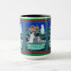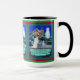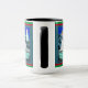Hermosa taza de Eskie y Escritura Angel de una colorida y detallada escena de invierno con un sucio y sin hogar perro esquimal blanco-americano que está perdido en una tormenta de nieve. El perro está de rodillas dobladas y rezando con patas juntas a un glorioso Ser Celestial Angélico. Tiene un hermoso aura morada y blanca alrededor de su cabeza y está a la entrada de una casa encantadora. Ha abierto la puerta de hierro para el perro perdido y le da la bienvenida al perro a través de la puerta con las manos extendidas. Ella ha santificado este hogar como el nuevo hogar del perro envolviendo con chispas azules del cielo. Esta escena acompaña al versículo de la Biblia Mateo 6:33, "Pero primero buscáis el reino de Dios y Su rectitud; y todas estas cosas os serán añadidas". Esta taza hace un regalo maravilloso o puede ser usada para recordarnos la Palabra de Dios.